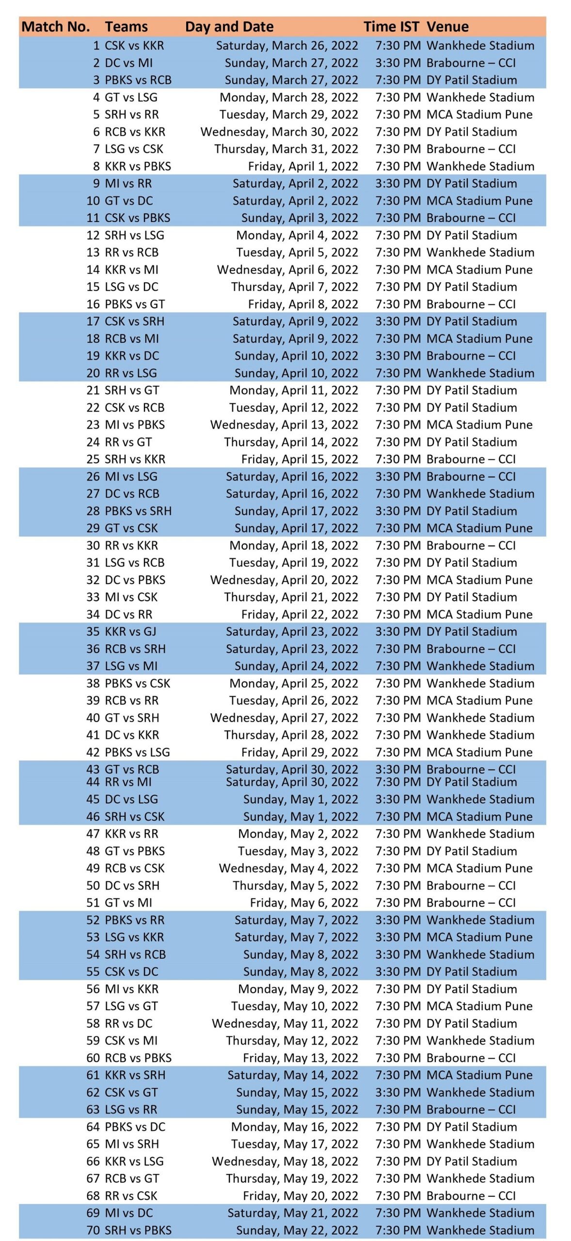 The IPL organizing committee will announce the full schedule for the TATA Indian Premier League. IPL starts on 26 March 2026. Chennai Super Kings won the IPL 2021 title and Gujarat Titans won the 2022 title. CSK won the 2023 IPL tournament. Kolkata Knight Riders won the 2024 title by defeating Sunrisers Hyderabad. RCB is the current champion and they are the defending champion.